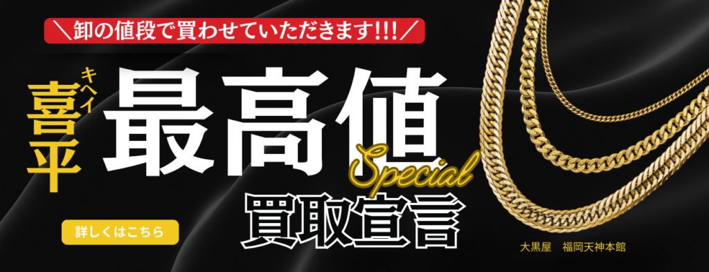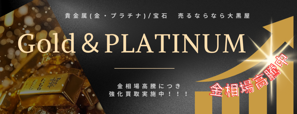 新型コロナウイルスの感染が拡大した2020年ごろより金・プラチナの価格は上昇しています。コロナが落ち着いた後も世界情勢が不安定なこともあり現在まで右肩上がりの値動きとなっています。そんな価値ある貴金属・宝石だからこそ少しでも高く売りたいと思うのは当然です。そんな時はぜひ大黒屋へお任せください。大黒屋は自信をもって高額買取させて頂きます。