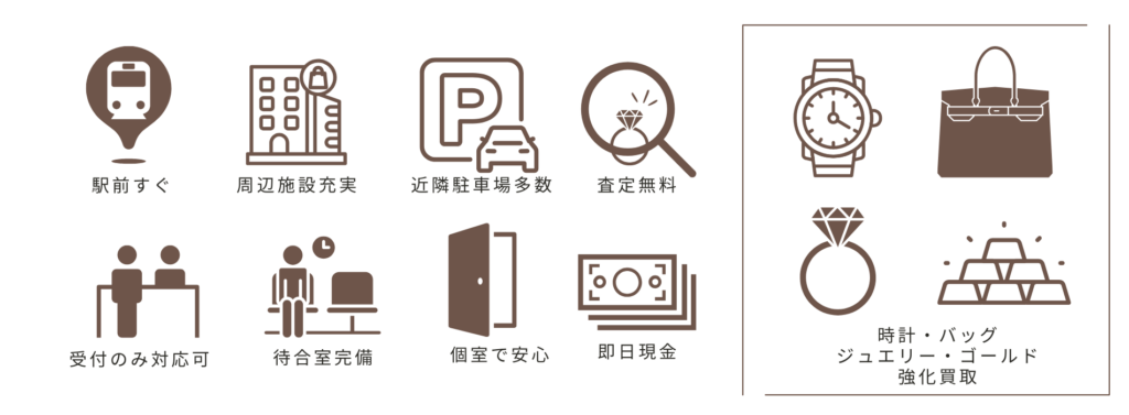 時計・バッグ・ジュエリー・宝石・金・プラチナなど様々なアイテムのお買取り・質預かりを行っております。