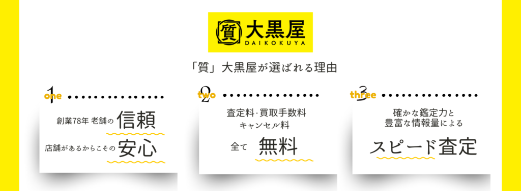 1947年創業の「質大黒屋」は今年で78年目になります。老舗の安心と信頼・長年の実績が私たちの強みです。そんな大黒屋の九州地区旗艦店である「福岡天神本館」は天神の真ん中に店舗を構え、皆様をお待ちしております。